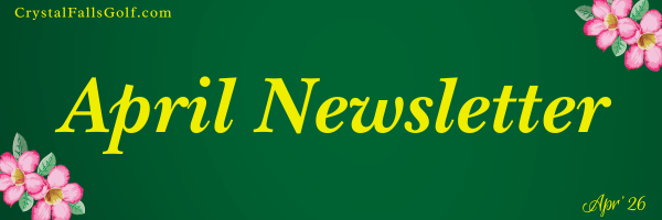 - Monday, April 13: Par 3 Challenge, our monthly club tournament and fourth event in the 2026 Crystal Cup series. The golf course will be set with 18 par 3 holes! 2-Person teams, individual stroke, scoring low ball. 9:00 a.m. shotgun, will pair up singles. Information & Registration
