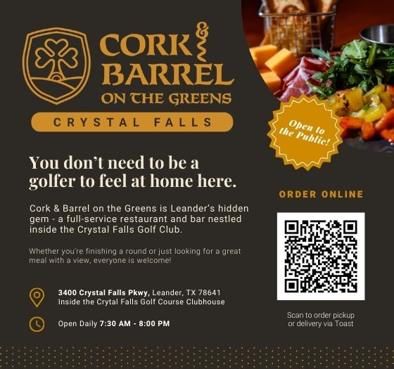 Cork & Barrel on the greens is open daily to cater to your food and beverage needs. Online orders https://www.toasttab.com/cork-n-barrel-leander-3400-crystal-falls-parkway
